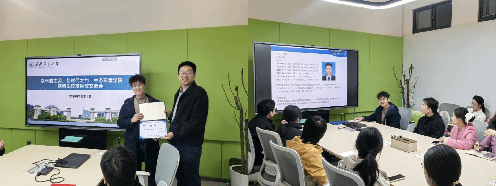 活动中,学院研究生辅导员陈帆向张虓颁发校外职场导师聘书,希望借助校友力量实现备考指导、岗位适应与职业规划的精准支持。张虓围绕备考方法、岗位认知和职业规划三个方面展开交流:在备考环节,他从选岗策略、材料准备、笔试面试技巧到政审体检要点进行了系统讲解,为学生提供了清晰的全流程参考;在岗位介绍部分,他结合自身经历,详述基层工作内容、强度环境、薪资待遇及发展路径,帮助同学们形成更真实的职业判断。互动答疑中,他就“跨专业优势”、“基层适应”、“长期发展”等问题一一回应。